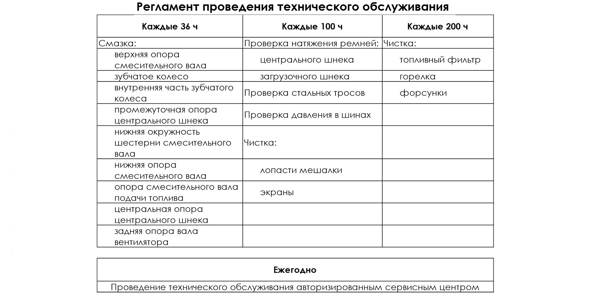 Завод Fratelli Pedrotti рекомендует проводить плановое техническое обслуживание согласно Руководству по гарантийному обслуживанию, выдаваемому с каждой единицей техники. На этой странице вы видите регламент проведения ТО для вашей модели техники.
